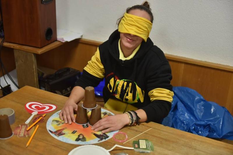 V pátek podvečer se všichni účastníci postupně slezli na Relaxe, kde nás po večeři čekala praktická ukázka indoor her. Na začátek jsme si procvičili své pantomimické, řečové a hmatové dovednosti u oblíbené hry Stavitelé, ve které se slepý dělník snaží postavit dle pokynů stavbyvedoucího, který mu slovně vysvětluje, co má dělat. Stavbyvedoucí přijímá pokyny od architekta, který však nemůže mluvit - tedy pomocí pantomimy vysvětluje, co se má stavět, jako jediný totiž zná zadání.