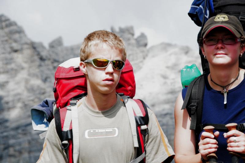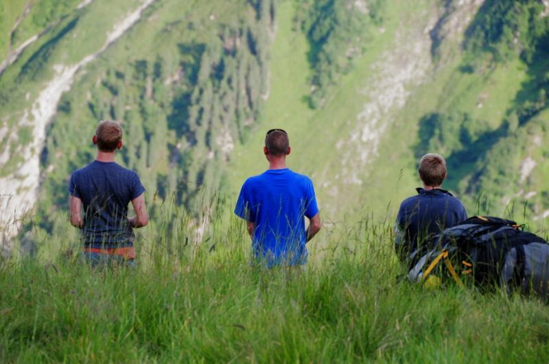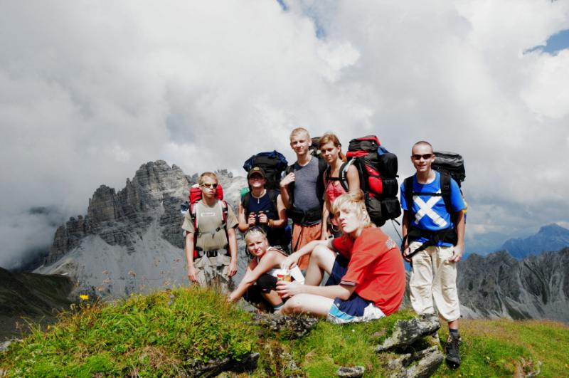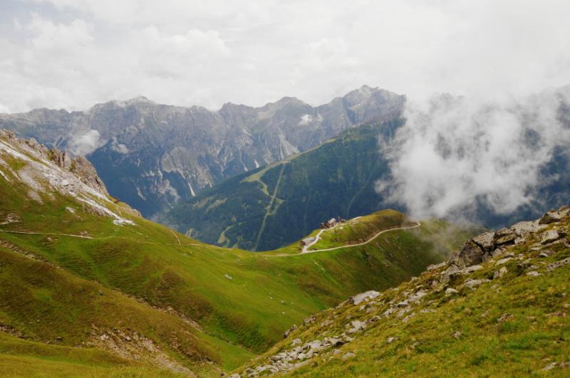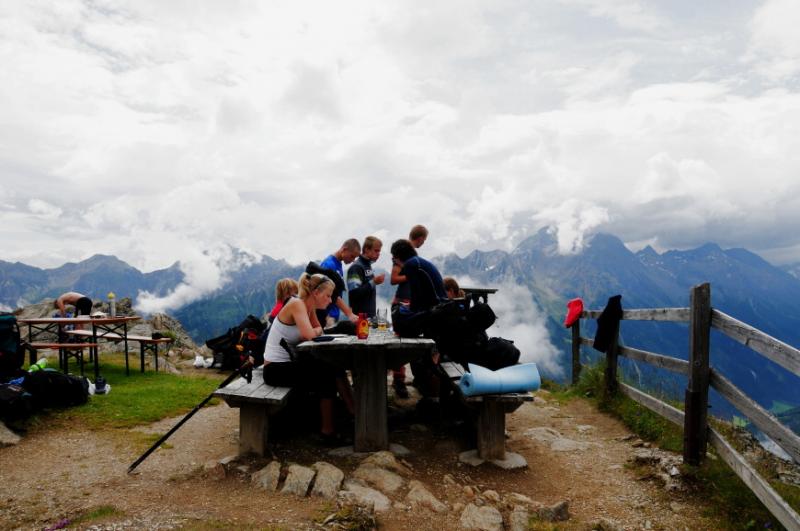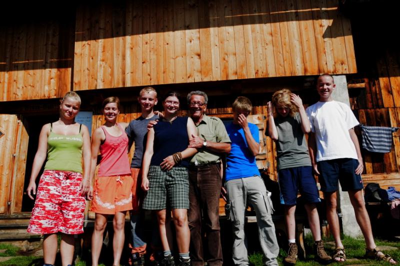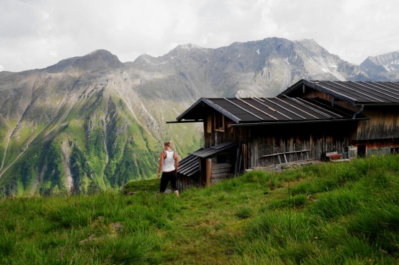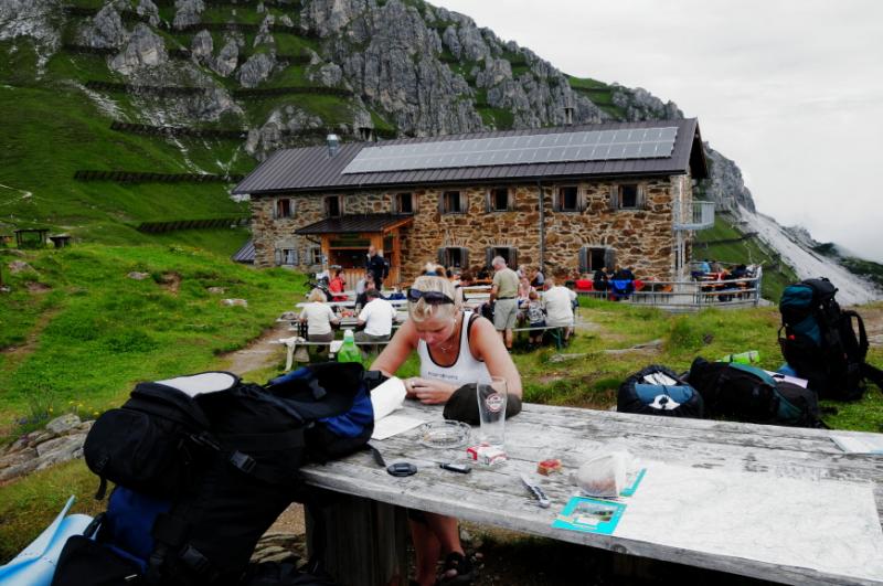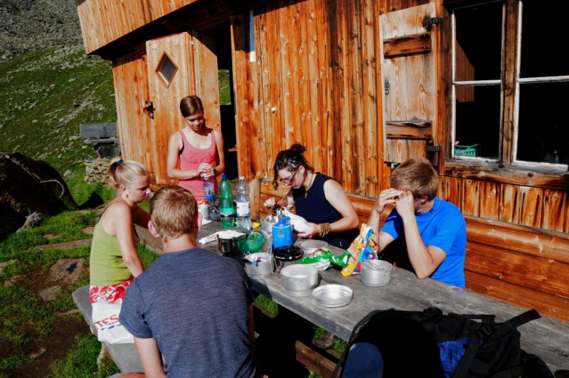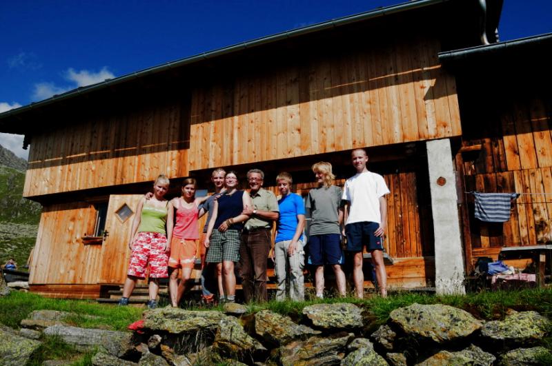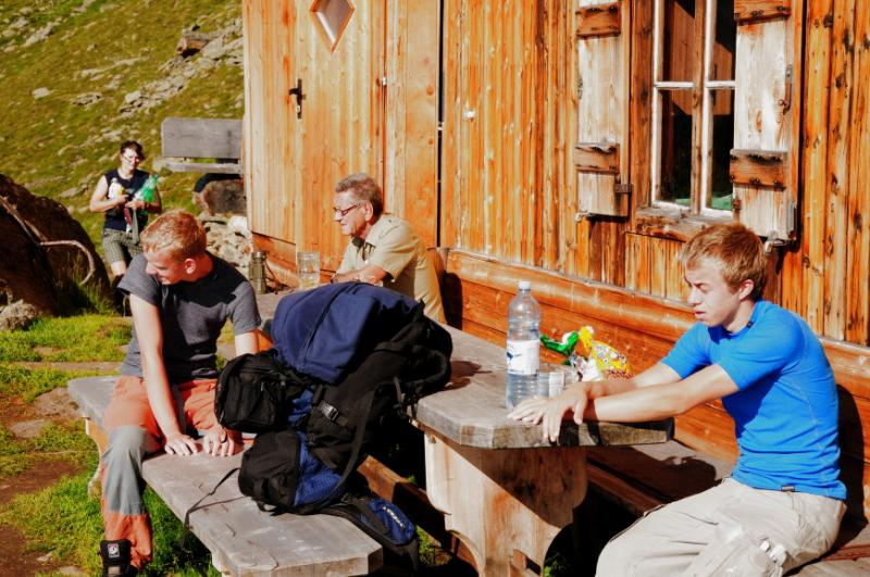 Když už se všichni konečně napapají, začínáme přemýšlet, u jaké chaty jsme se to vlastně zakempovali. Za chvíli vyrážíme na obhlídku. A naše zjištění je velmi příjemné. Chata má totiž velmi milého obyvatele, pravého tyrolského horala, který nám vysvětluje, že u něj v chatě můžeme zadarmo přespat, použít jeho kuchyň, posedět jak dlouho budeme chtít...Když se divíme jeho srdečnosti, vysvětluje nám, že se svojí malou horskou chatou s maličkou hospůdkou si dost vydělá na bohatých němcích, kteří sem chodí a hrají si na horské turisty, ty že oškube velmi rád, ale výpravy jako je naše, na těch nepotřebuje a nechce vydělávat....tolik volný překlad, kdyby byl překlad doslovný, bylo by to jistě čtivější, ale vzhledem k tomu, že pán používal při komentování obtloustlých turistů z Německa dosti specifické výrazy, nebudeme se do doslovného překladu pouštět, a čtenář si jistě sám domyslí.