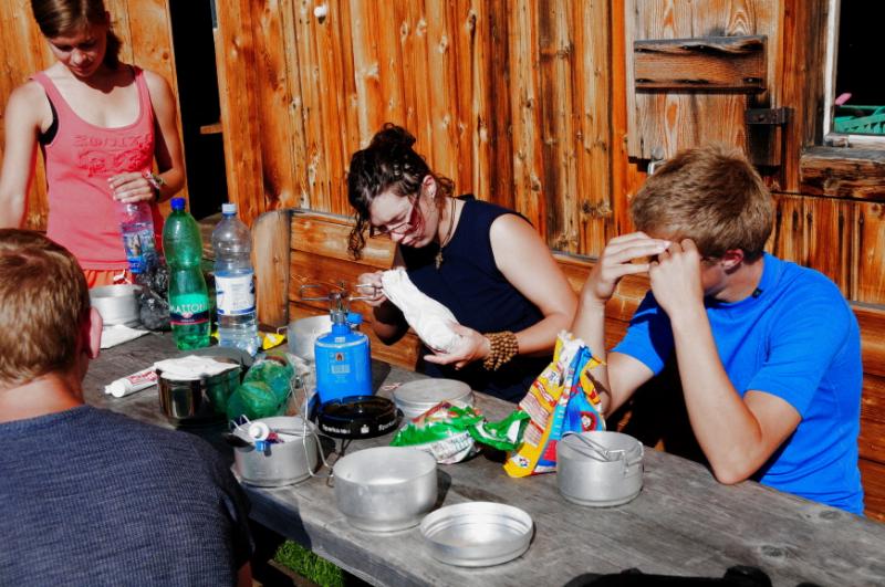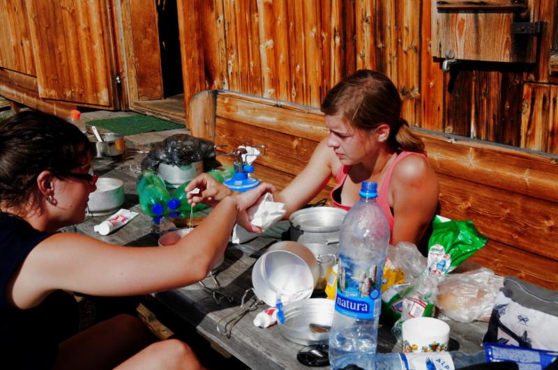 Nikomu se však nechce čekat, než se jídlo uvaří, a tak se jako předkrm podává na kolovačku štangle lovečáku. Hanka rozechvělá z toho, že všichni ostatní už baští, a ona čeká až se to dovaří, udělá pár méně šikovných pohybů, načež ešus letí z vařiče dolů, a alpský kámen ozdobí české těstoviny v omáčce. Všem se to škodolibě dost líbí, až na mně, protože půlka porce měla být má a jelikož kolínka z mechem, trávou a ovčími bobky jíst nehodlám (snad někdy jindy, tentokráte ještě přeci jen takový hlad nemám) musím počkat, jestli bude Hanka obdobně šikovná i při druhém pokusu.