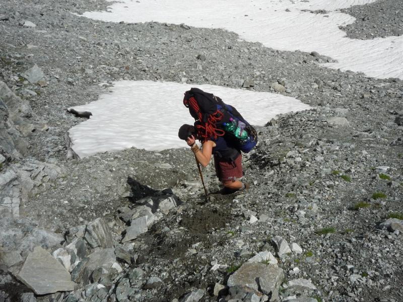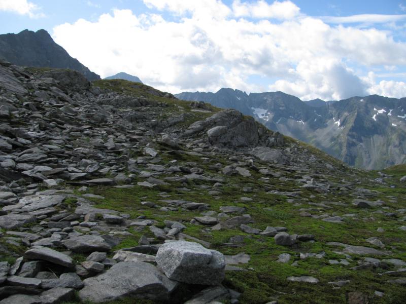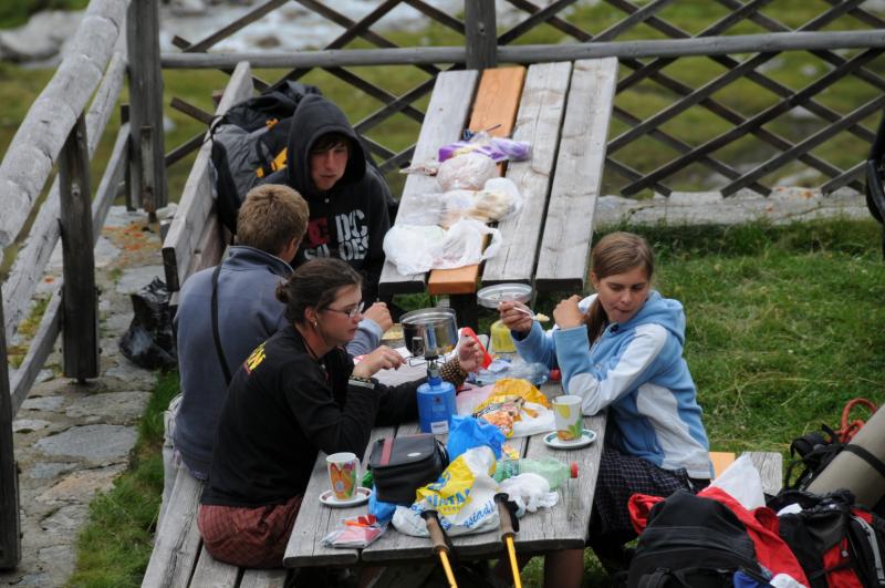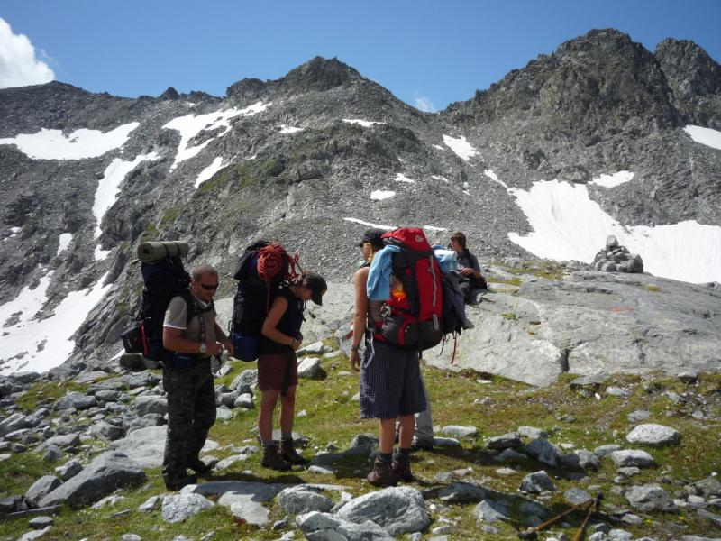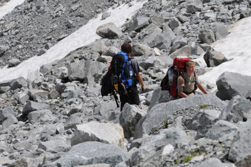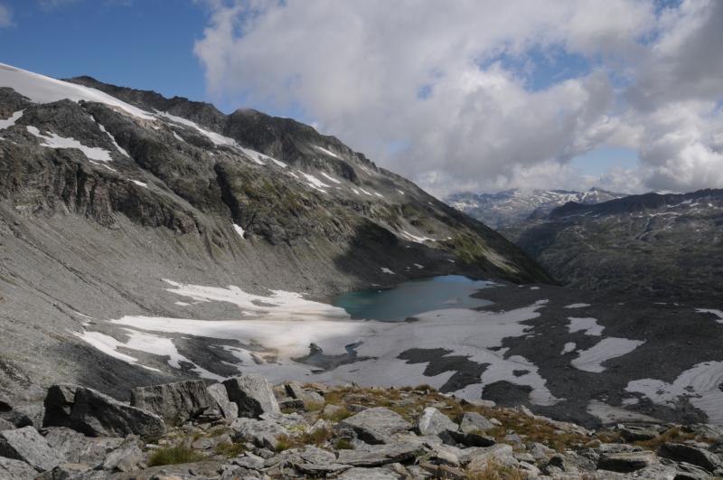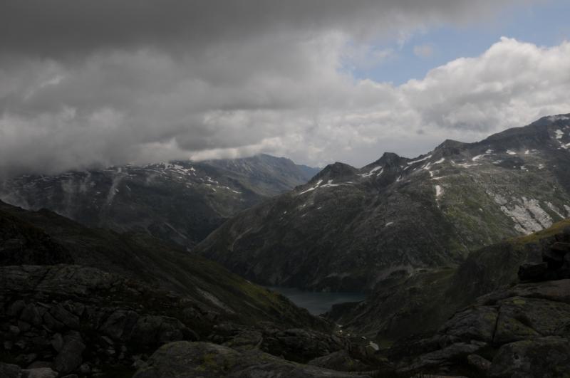 Čtvrtek, ráno: Vstáváme, víčka snad tak těžká jako naše nohy, přes noc trochu zapršelo, to si ověřujeme, když z batohů vylíváme nějakou tu dešťovou vodu. Vaříme, balíme, odcházíme, dnešním cílem je zakempit někde v co největší blízkosti obrovské vodní přehrady, která je opravdovou raritou. Má to jen malou chybičku, musíme sklesat asi 700 metrů, které však další den budeme muset nastoupat, dobrá, není to zase až tak malá chybička, ale jiné cesty není, tak s chutí do toho, což o to, dolů to jde, ale představa zítřka není pěkná. No, co, dnes je dnes a zítra je zítra. Zítřek nám z hlav vytěsní i okamžik, kdy se ztratí značení a my vidíme jen hluboko pod sebe, kde se na konci kamenitého pole bělá pole sněhové. Alespoň se nám to prostřídalo, prvně to byl sníh a pod ním kámen, tehdy by byl dopad zlý, ovšem teď už by dojmy z jízdy po k zadku po kamenech ani sebeměkčí a sebechladnější sníh nespravil, to už by bylo na zručného plastického chirurga. Víceméně po poledni, no, tedy spíš více, než méně, scházíme k Osnabrücker Hutte, kde dáváme polední pauzičku a konzultujeme svůj další postup s mapou. Jsme neskutečně rádi, že jsme návrh na okružní cestu okolo jezer zamítli, cesta je i bez nich dlouhá a počasí má zase nějaké choutky nechat nás promoknout.