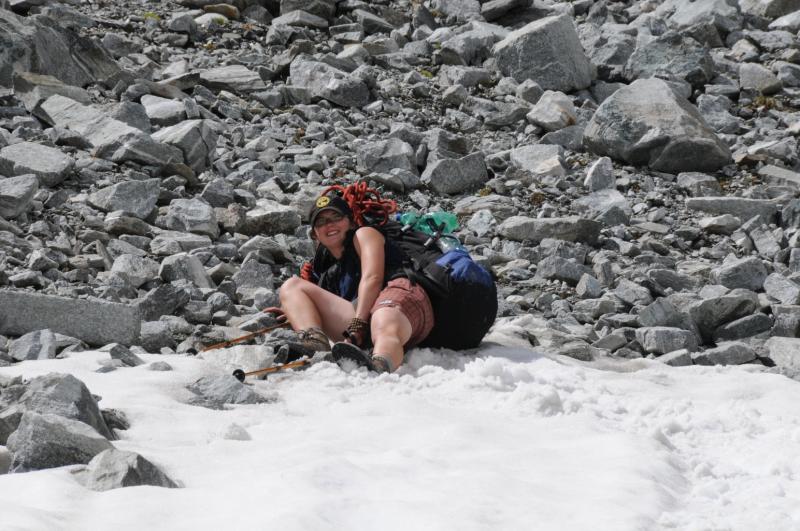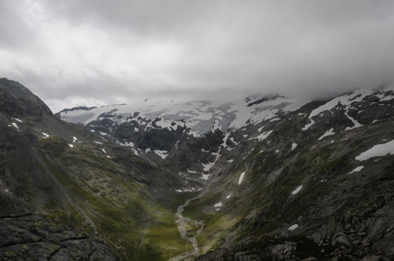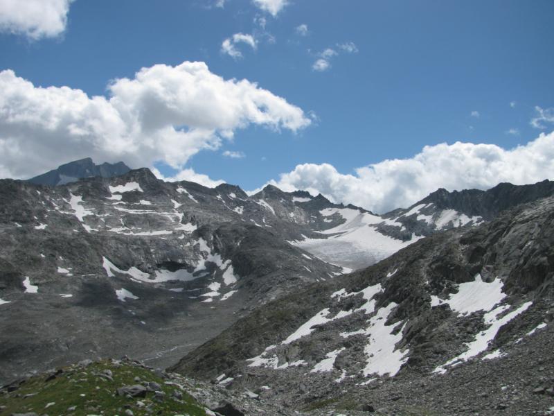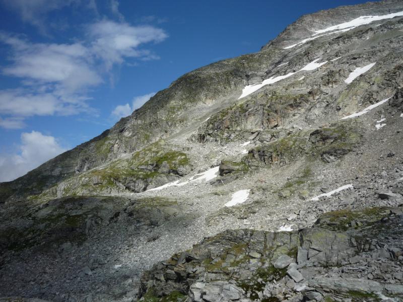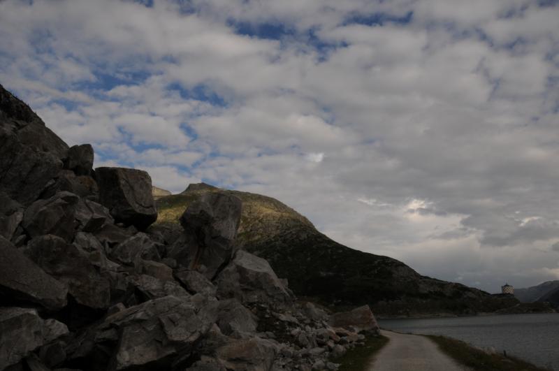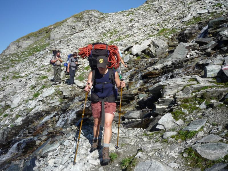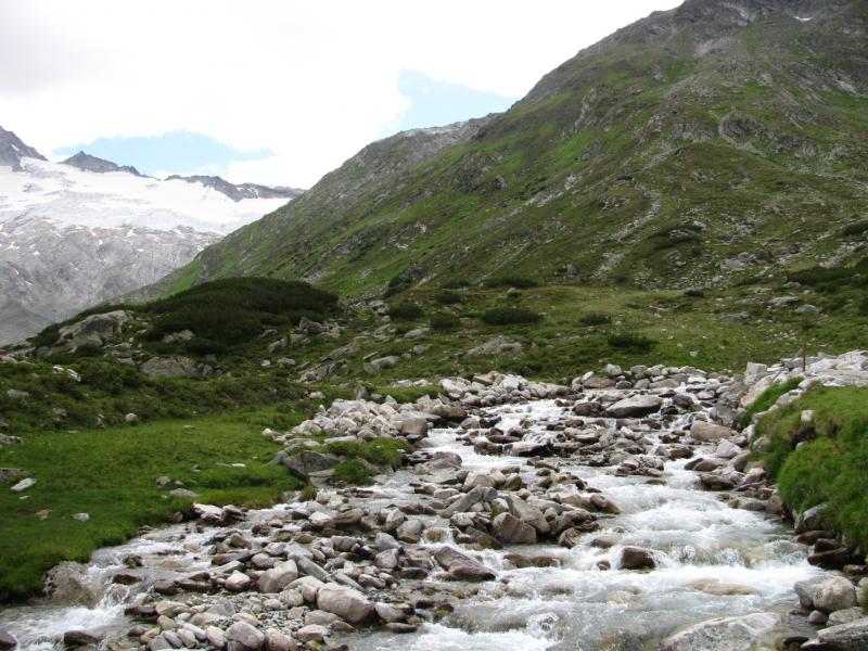 Čtvrtek, ráno: Vstáváme, víčka snad tak těžká jako naše nohy, přes noc trochu zapršelo, to si ověřujeme, když z batohů vylíváme nějakou tu dešťovou vodu. Vaříme, balíme, odcházíme, dnešním cílem je zakempit někde v co největší blízkosti obrovské vodní přehrady, která je opravdovou raritou. Má to jen malou chybičku, musíme sklesat asi 700 metrů, které však další den budeme muset nastoupat, dobrá, není to zase až tak malá chybička, ale jiné cesty není, tak s chutí do toho, což o to, dolů to jde, ale představa zítřka není pěkná. No, co, dnes je dnes a zítra je zítra. Zítřek nám z hlav vytěsní i okamžik, kdy se ztratí značení a my vidíme jen hluboko pod sebe, kde se na konci kamenitého pole bělá pole sněhové. Alespoň se nám to prostřídalo, prvně to byl sníh a pod ním kámen, tehdy by byl dopad zlý, ovšem teď už by dojmy z jízdy po k zadku po kamenech ani sebeměkčí a sebechladnější sníh nespravil, to už by bylo na zručného plastického chirurga. Víceméně po poledni, no, tedy spíš více, než méně, scházíme k Osnabrücker Hutte, kde dáváme polední pauzičku a konzultujeme svůj další postup s mapou. Jsme neskutečně rádi, že jsme návrh na okružní cestu okolo jezer zamítli, cesta je i bez nich dlouhá a počasí má zase nějaké choutky nechat nás promoknout.
