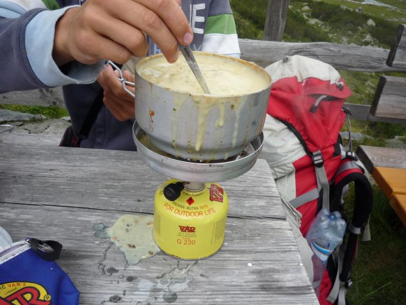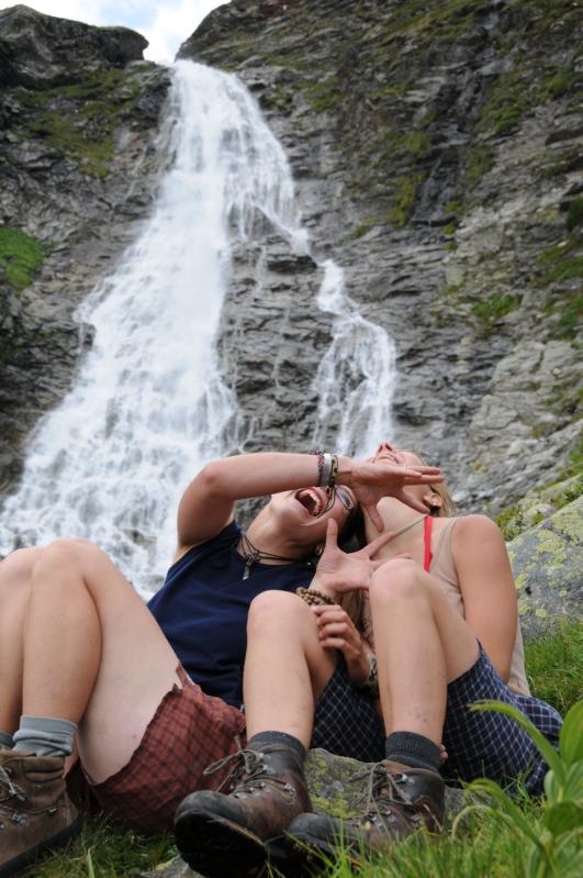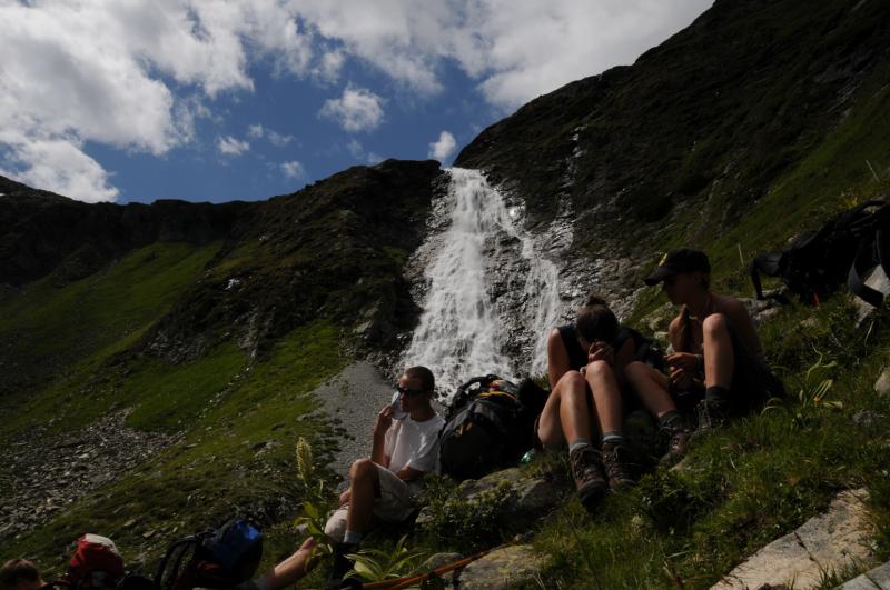 Pátek, odpoledne: Sestup 1400 metrů je celkem silná kávička, ale když člověk špatně došlápne, tak sestupuje doopravdy rychle. Se značením cesty to Rakušani taky moc nepřeháněli. Možná už jim docházela barva a tak s ní šetřili všude, kde to šlo. Naštěstí bylo jasné, že jediná cesta je směrem dolů, a tak jsme hledali kudy to půjde a nebude to moc bolet. Našli jsme, sice to občas bolelo, ale určitě mohlo být i hůř. Každopádně, toho, kdo vymýšlel tu cestu, bych chtěla potkat, ale věřím tomu, že on by mě potkat nechtěl. Na střídačku jsme totiž procházeli potokem, přelézali kameny a procházeli cestičkou tak úzkou, že se vedle sebe nevešly ani dvě nohy, když jedna druhou míjela. Abychom se nenudili, tak občas přišel nějaký ten úsek se spoustou bahna, před kterým nebylo úniku. Se značením na stromech se také pytel neroztrhl, proto není divu, že nám kluci zabloudili a museli se po kolena brodit potokem. No co, k autu se předsunutá dvojice dostala stopem a autobusy a dojeli před konec lesa, na začátek silnice, zrovna když zbytek vylézal z lesa. Opravdu přesné načasování. Navlečeme se do čistého a jakžtakž i voňavého oblečení, nasedneme do auta a uháníme okupovat první benzínku, kde mají velké a čerstvé bagety....